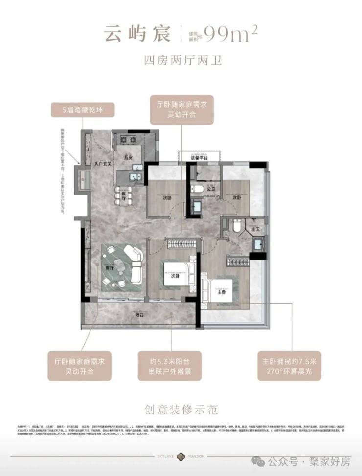99㎡的4房2厅2卫,设计的是竖厅格局,客厅3.35米开间,LDKB一体化,S墙设计预留双开门冰箱卡槽位,三开间朝南,动静分区,U型厨房,公卫三段式干湿分离,赠送设备平台,得房率约78.27%(不含赠送),客厅连接次卧出9.37m²大阳台西南或东南朝向。靓点:99平做到了4房2卫,主卧270°无柱转角飘窗,厨房烟道外置+额外赠送设备平台,并且是纯南向格局。