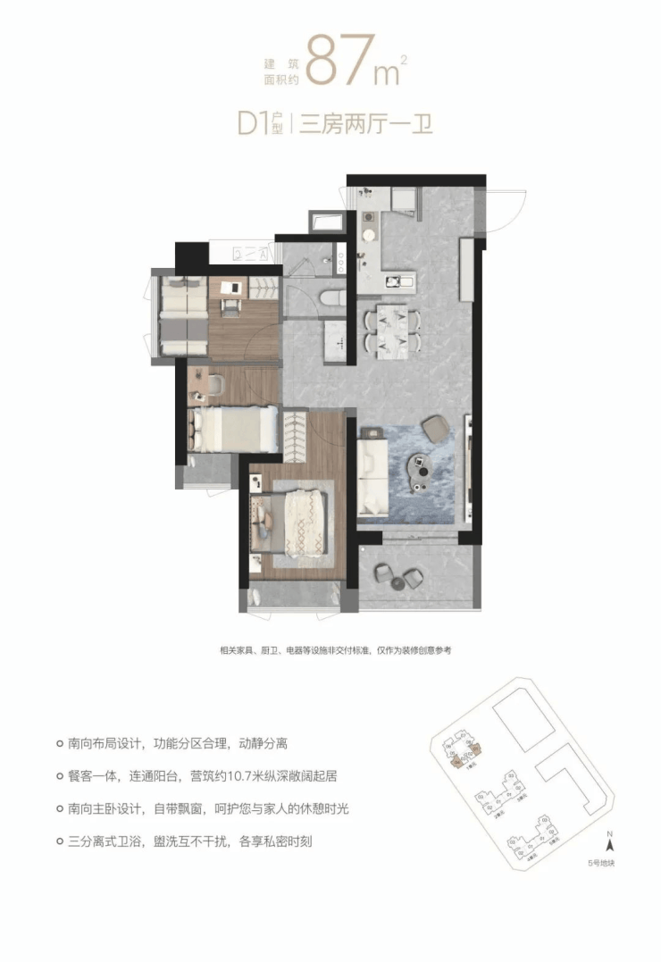 “10.7 m纵深紧凑南向三房”,10.7 m纵深餐客一体,通风采光极佳