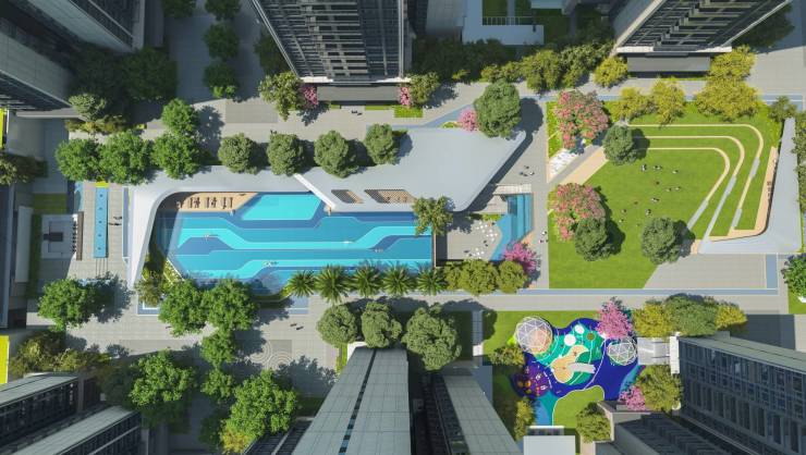 中央景观泳池、奇幻下沉庭院、浪漫星光飞瀑、活力阳光草阶、韵动星光跑道、智趣童享乐园…约2.6万㎡未来主义风格园林,营造从空间到精神的全龄交互体验。