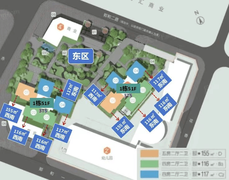 目前加推东区,整个小区有4栋建筑,1/3栋是商品房建筑,2栋是幼儿园、4栋是商业;东区占地1.35万㎡,480套116-155平米4房,均是3T5户,总层高51层,楼是架空层,16/34为避难层。