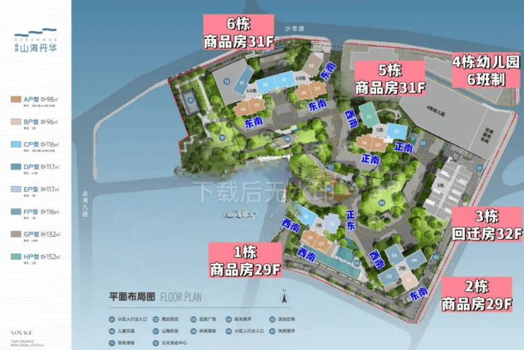 山海丹华府,由南山本土名企桑泰集团打造,总占地面积约2.94万㎡,总建筑面积约14.31万㎡,计容建筑面积约9.5万㎡,容积率3.37,绿化率40%,共由5栋29-32F高的住宅组成,其中1/2栋商品房29F,3栋回迁房32F,5栋/6栋A/B座商品房31F,4栋是1所6班制幼儿园。