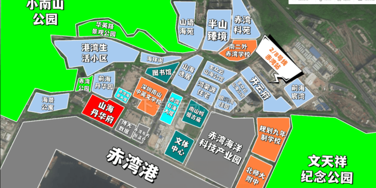山海丹华府,位于南山区招商街道少帝路南面赤湾七路西面,地处前海赤湾板块,作为“蛇口国际海洋城”三大主要承载区之一,与太子湾片区,蛇口片区共同融入深圳“太空港-前海-蛇口”西部海洋科技创新走廊,定位为“赤湾海洋科技创新区”。