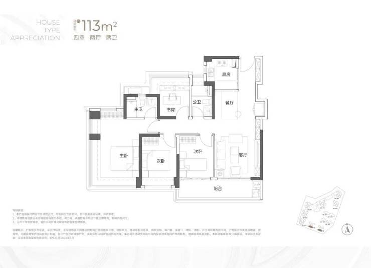 108-110㎡的4房2厅2卫:竖厅双龙抱珠格局,客厅开间3.5米,LDKB一体化,4个卧室分别做到了3.7米/3.4米/2.8米/2.6米的宽度,主卧加2个次卧270°全景飘窗,客厅连接次卧出6.1米长的大阳台,U型厨房,得房率约95-97%(包含赠送),西南或东南朝向。