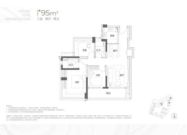 95㎡的3房2厅2卫:传统竖厅格局,客厅开间3.5米,LDKB一体化,S墙设计预留冰箱卡槽位,3个卧室分别做到了3.6米/2.8米/2.8米的宽度,主卧加1个次卧270°全景飘窗,客厅连接次卧出6.3米长的大阳台,U型厨房,得房率约95-97%(包含赠送),西南或东北朝向。