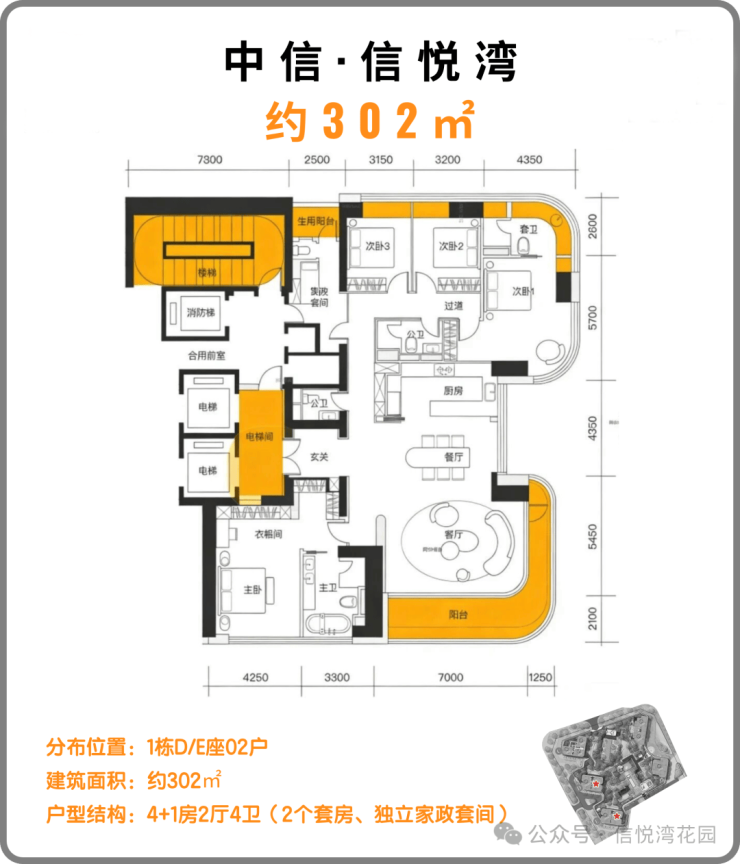 约302㎡户型分布在1栋D/E座,3梯2户,层高3.5米,4+1房2厅4卫配比。