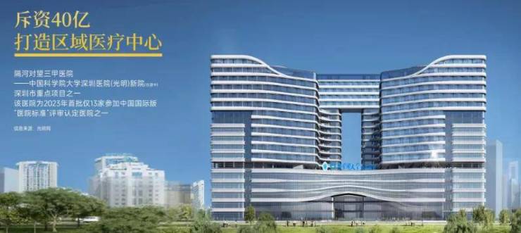 “中国科学院大学深圳医院(光明)新院”,政府投资 40 亿打造的三甲医院,未来将打造成区域医疗中心,是深圳市重点项目之一,预计 2025 年建成并投入使用。项目用地面积约 5 万平方米,总建筑面积为33.7 万平方米,可提供床位 1500 个,将有效缓解群众看病难的问题。