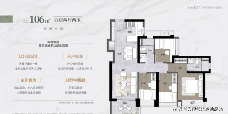 106㎡的4房2厅2卫,设计的是竖厅格局,客厅3.2米开间,LDKB一体化,S墙设计预留冰箱卡槽位,四开间朝南,4个卧室分别做到了3米/2.7米/2.25米/2.2米的宽度,U型厨房,公卫三段式分离设计,得房率:76.11%(不含赠送),有西南或东南朝向。