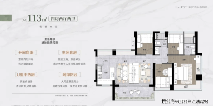 113㎡的4房2厅2卫,设计的是横厅南北通透格局,客餐厅5.65米开间,四开间朝南,全屋飘窗设计,4个卧室分别做到了3.2米/2.6米/2.45米/2.25米的宽度,主卧270度环幕视野,U型中西厨房,公卫三段式分离设计,得房率:76.54%(不含赠送),阳台主朝东南向。