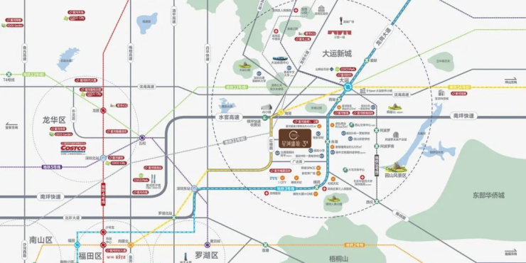 家门口超13万㎡商业(盛境约4.4万㎡,卓弘星辰约3.6万㎡(在建)、智荟约2万㎡),约2公里范围内覆盖30万㎡商业,繁华商圈拥簇,酣熟生活即刻兑现。5公里内更享百万平商业,星河COCOPark(龙岗山姆会员店)、SKY MALL、天光城等知名商业体环伺,尽揽都市繁华便利。
