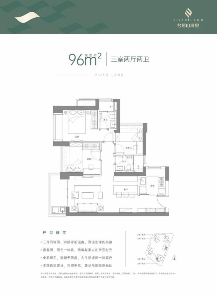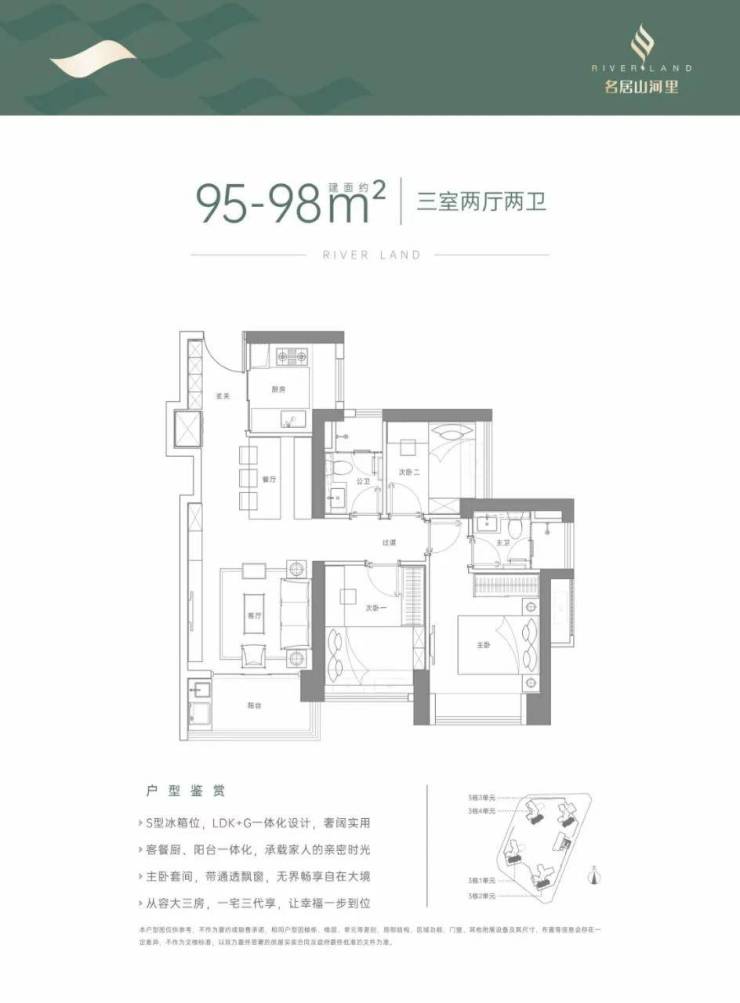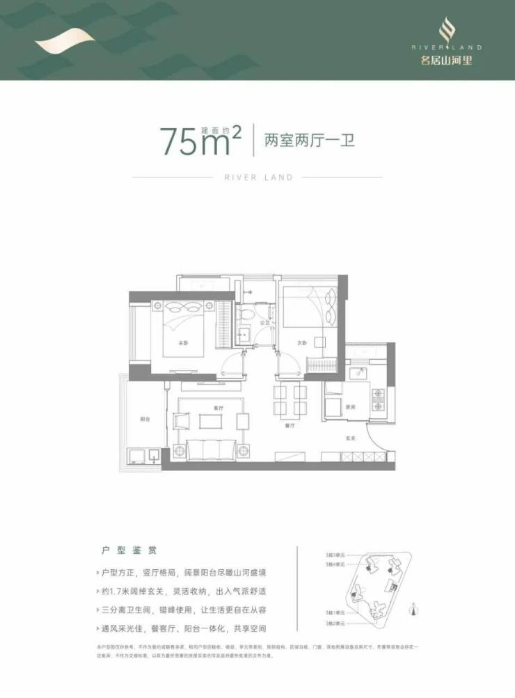 『水岸生活』 建面约75-141㎡ 精质舒居总建面约48万㎡山河大城崛起,匠筑城市封面级立面,毫米级精工雕琢空间。室内设计以人为本,s型冰箱位、LDK+G一体化设计更显奢阔,户型方正,户户朝南,大面积采光,带IMAX宽景阳台,俯瞰山河,诠释生活的至臻格调。