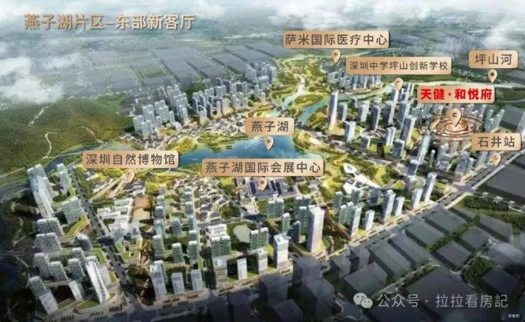 2021年深圳两会提及加快建设9大区域,包括燕子湖新区,坪山十四五提出“1+7+N”重点片区格局,1为燕子湖,市级区级双重背书,高标准打造定位东部城市新客厅。