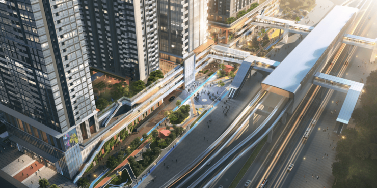 垂直交通场景:多首层设计,空中连板、无风雨连廊等,形成住宅、商业、办公与地面公交、空中地铁的接驳体系。