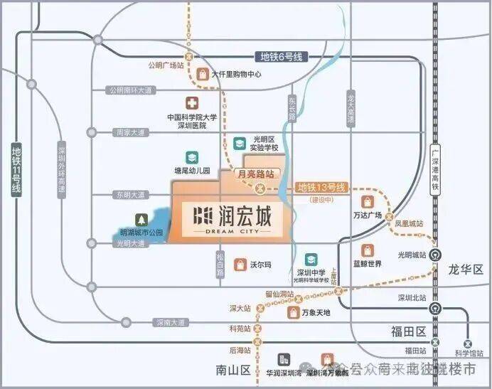 华润润宏城位于光明区凤凰街道塘尾社区,光明大道和东长路交汇处的西北侧,刚好在13号线“月亮路站”附近,北部接壤东周路。