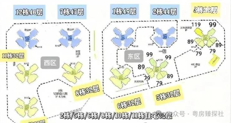 东区:占地约2.1万㎡,容积率5.28,包含住宅、商业、文化活动室、老年人日间照料中心和其他基础配套设施。1栋45F,2栋44F,3T6户;3/5栋32F,2T6户;6栋32F,2T5户;4栋商业2F。东区5栋已全部入市。