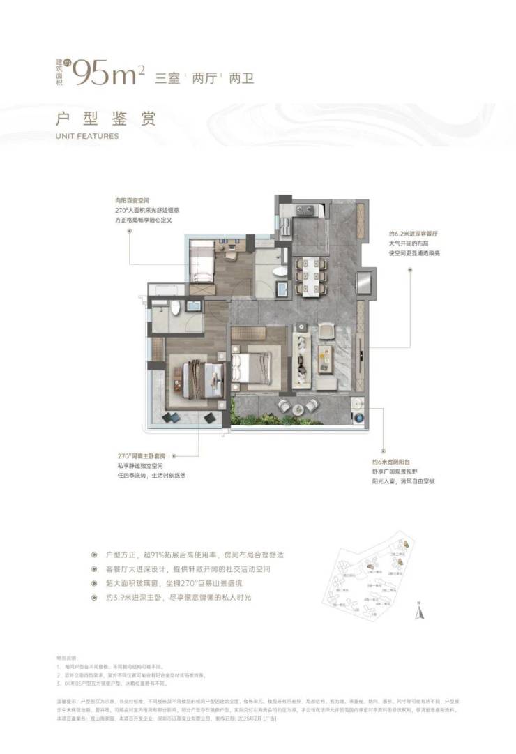 95㎡的3房2厅2卫,设计的是经典竖厅格局,客厅3.5米开间,LDKB一体化设计,主卧270°观景大飘窗,3个卧室分别做到了主卧15.24㎡/次卧7.68㎡/次卧7.55㎡(实测面积,去掉墙体),客厅连接次卧出6.3米长的大阳台,L型厨房,卫生间干湿分离,赠送面积超11.7㎡,得房率约95%(包含赠送),东北或西南朝向。