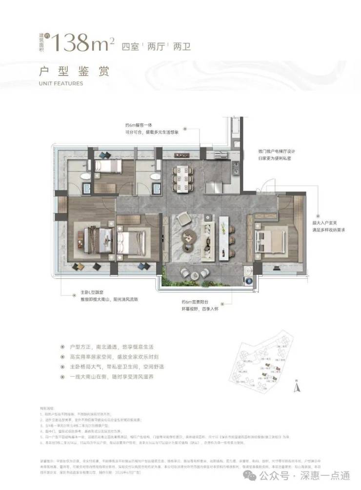 南山前海,观山海家园于2025年7月23日取证入市,本次加推4栋,共64套房源,面积都是138㎡的4房2厅2卫南北通透户型,总高17层的板楼,2梯2户,并且是专梯入户板楼设计,备案均价9.6万/㎡,备案单价8.49-10.98万/㎡,总价在1170-1513万/套,合同约定在2026年12月份带精装交房。