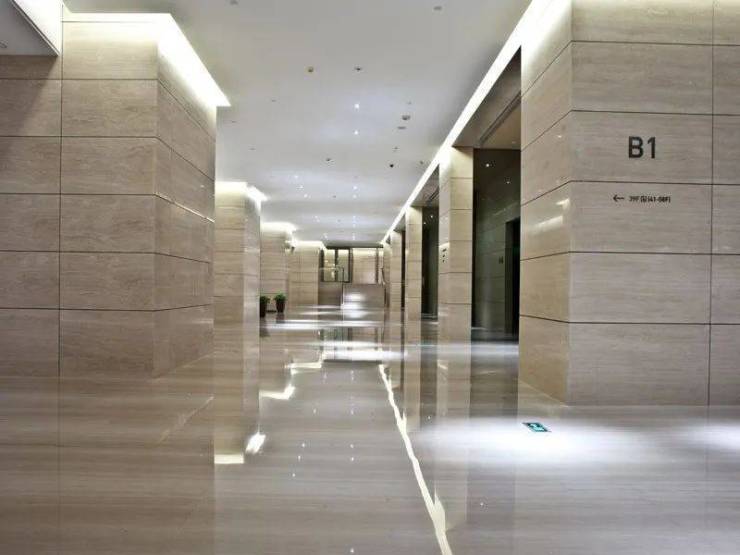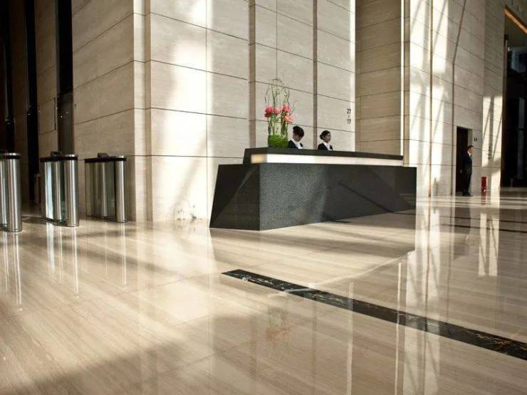 大堂宽敞明亮、气势磅礴,米白色的木纹石墙面与地面相容,简洁大方。别具特色的服务台在宽敞的大厅里特别吸引人眼球,其中高贵优雅的白玉石插入在黑色的花岗石中非常醒目,更特别的是其设计超越以往的规则束缚,正侧面都是由简单的不在同一平面上的三角形组合而成,突显出线面的组合美,给人立体感,既简单却又不乏艺术美,与众不同。