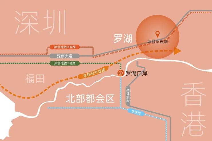 罗湖位于深港互动圈前沿,邻近香港“北部都会区”,引入香港东铁,实施“一地两检”,打造深圳火车站-罗湖口岸片区,罗湖将成为深港轨道中枢。项目近邻罗湖口岸,与香港高效通勤,坐享深港都市圈发展红利。