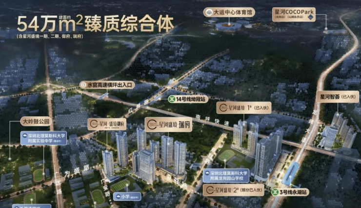 总建筑面积约54万㎡(含盛境一期、二期、御府、瑞府),集住宅、商业、公寓、办公等于一体的臻质综合体,打造星河大城品质生活圈,传承星河系匠心品筑精神,礼献都市人居典范。