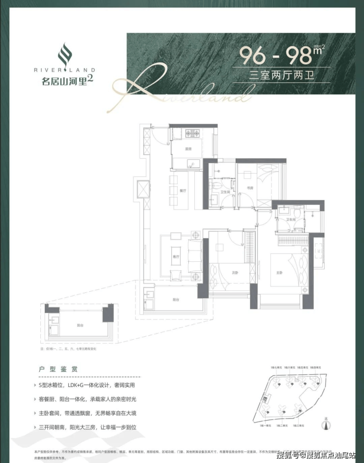96-98㎡的3房2厅2卫,1-7单元05户型,设计的是经典竖厅格局,客厅3.5米开间,S墙设计预留冰箱位,三开间朝南,3个卧室分别做到了主卧12.39㎡/次卧9.54㎡/次卧6.11㎡(实测面积,去掉墙体),得房率:73.86%(不含赠送),阳台1.5米进深,东南朝向。