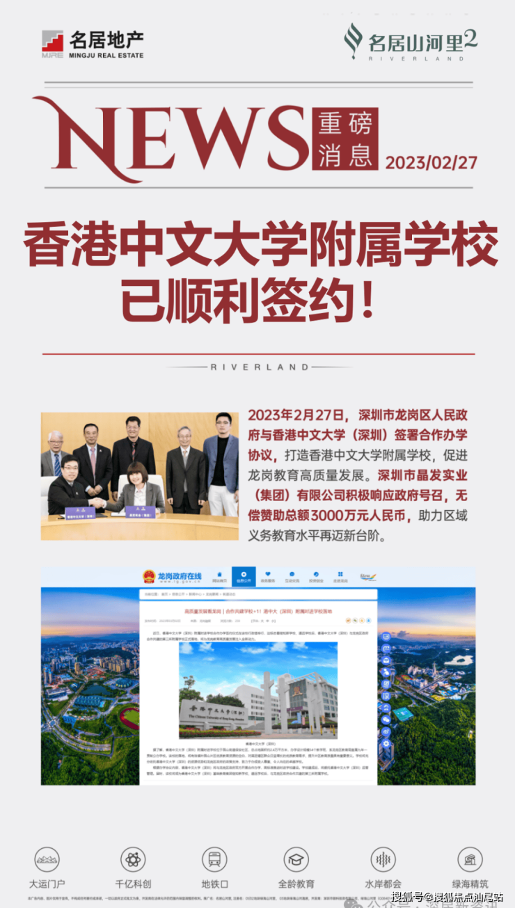 项目自带1所18班制幼儿园,家门口的香港中文大学(深圳)附属时进学校,该校是1所九年制公办学校,规划有54个教学班,也是香港中文大学(深圳)基础教育集团继大运的道远学校、知新学校之后,与龙岗区政府合作共建的第三所附属学校,在2023年的2月27日上午,香港中文大学(深圳)附属时进学校与龙岗区政府正式进行了合作办学签约仪式。