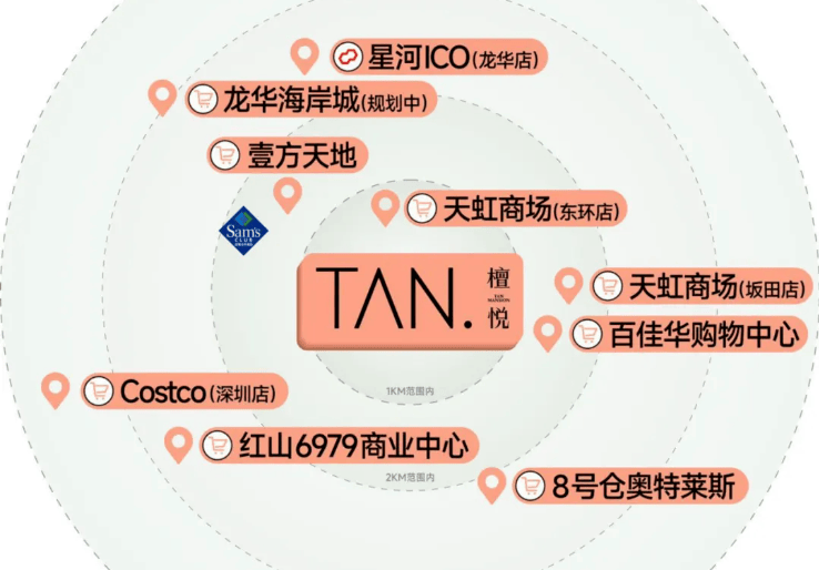 商业配套:檀悦府自带特色商业街,并且紧邻项目有天虹商场(东环店),距离壹方天地(建面约60万㎡航母级体验式商业集群)约1.5km,周边还有山姆会员店、天虹商场(坂田店)以及Costco会员旗舰店等,一站式满足不同生活需求。