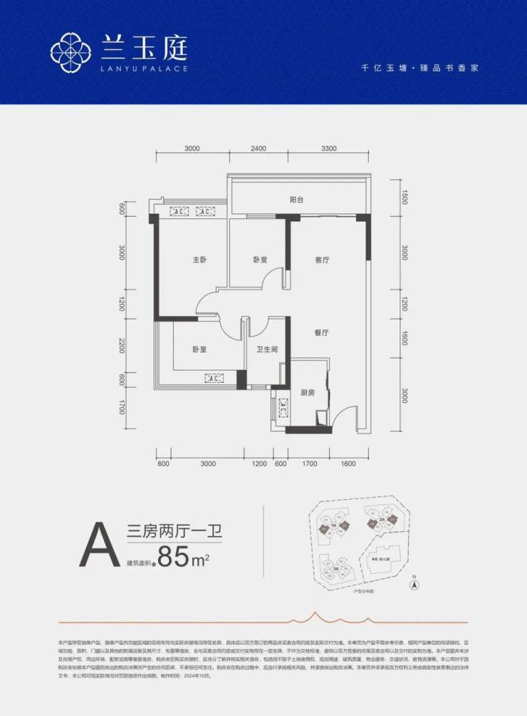 85㎡的3房2厅1卫,A户型,设计的是竖厅格局,客厅开间3.3米,LDKB一体化,三开间朝南,客厅连接次卧出5.7米长的大阳台,L型厨房,得房率:79.8%(不含赠送),西南或东南朝向。套内面积67.49㎡+赠送面积10.57㎡=实用78.06㎡,实际得房率92.28%。