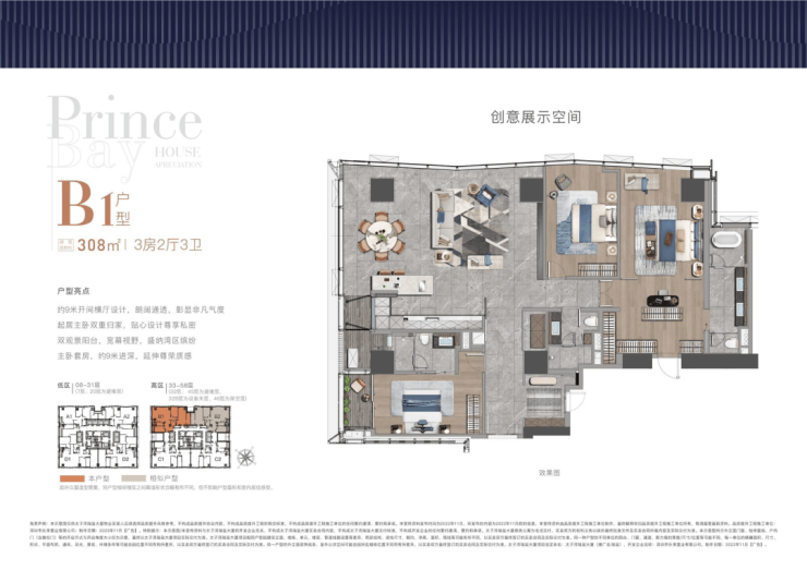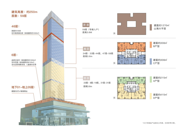 大平面大尺度定位,层高约3.6米,横厅设计确保最大化观景面,全户型纵享环幕视野。项目打造主力建面约215-415㎡纯粹品质公寓共191席,顶层为建面约1270㎡公寓产品。