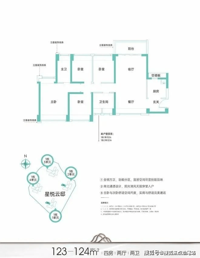 123-124㎡四房两厅两卫:竖厅南北通透格局,进门独立入户玄关,全屋飘窗设计,U型厨房。