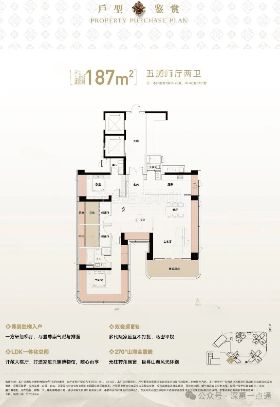 187㎡的5房2厅2卫,设计的是竖厅格局,尊享独立电梯入户,LDKB一体化设计,动静分区,三开间朝南,主卧270°无柱转角全景舱,L型厨房+岛台中西厨设计,公卫三段式干湿分离,得房率约111%(包含赠送),西南朝向看海景景观。