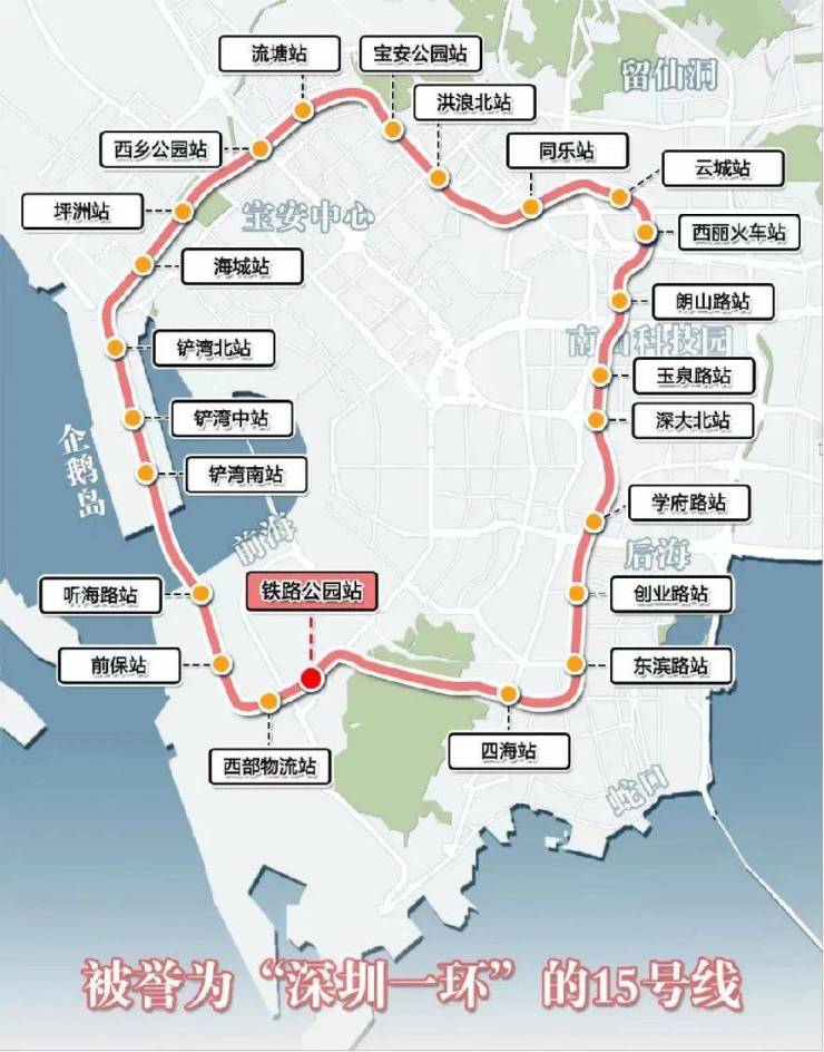 其中,地铁15号线是深圳首条环线轨道,起终点均为前海站,极速串联起前海、宝中、大铲湾、“腾讯科技岛(在建中)”、南山科技园、后海总部基地、留仙洞总部基地等高端产业密集区,是深圳最具有价值的一个圈。