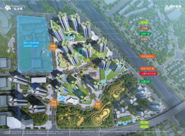 深圳远洋城,超百万方全配套综合大城,家门口南科大龙岗附属实验学校(在建中),家门口山厦公园,规划有3所幼儿园、约4万平米商业、文化活动中心、文化主题园林、四大主题泛会所架空层、写字楼等,以古树广场搭建人文住区的首开地块,为大城幸福生活赋能。