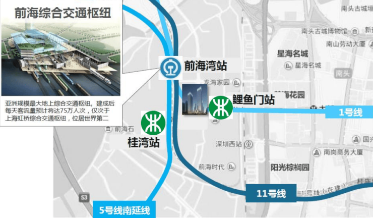 项目深圳市南山区梦海大道与桂湾四路交汇处;与地铁1号线(鲤鱼门站)、5号线(桂湾站)无缝接驳。