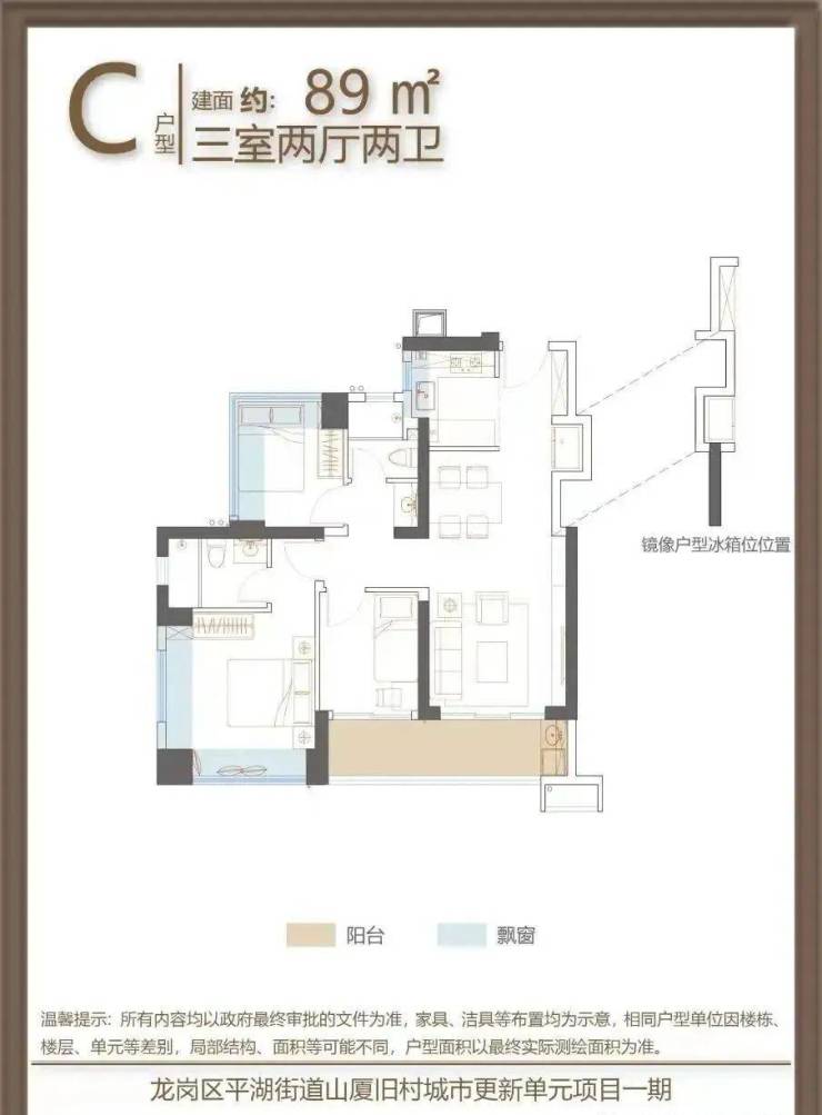 89㎡的3房2厅2卫,01.06户型,设计的是横厅南北通透格局,客餐厅6.12米开间,LDKB一体化,四开间朝南,主卧双飘窗南北通设计,3个卧室分别做到了主卧13.6㎡/次卧8.83㎡/次卧7.59㎡(包含墙体飘窗),L型厨房,卫生间干湿分离,得房率约91.14%(包含赠送),阳台主朝西南或东南向。
