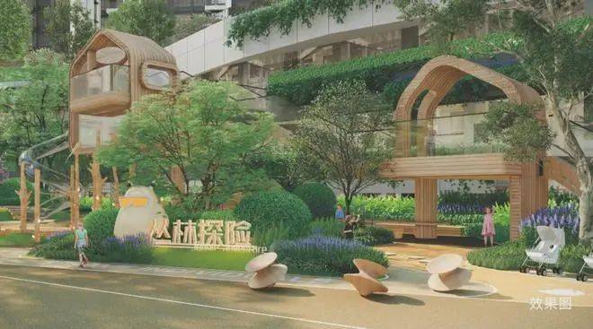 设置瞭望塔、树屋、攀岩墙等分龄段游戏区,高绿量的户外亲子互动场地。