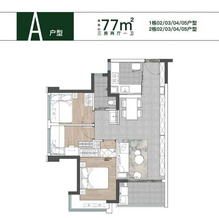 【主推产品】:74-77㎡三房一卫