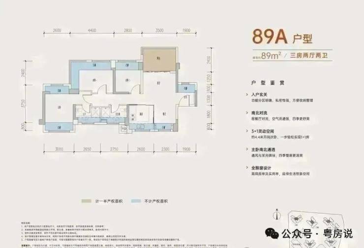89㎡的3+1房2厅2卫,A户型,设计的是竖厅南北通透格局,进门入户玄关,客厅3.5米开间,,五开间朝南,主卧南北通透双飘窗,3个卧室分别做到了主卧15.73㎡/次卧14.08㎡/次卧8.96㎡(包含墙体飘窗),得房率约:77.39%(不含赠送),阳台主朝东北向,这次推出最靓的户型可以改4房,赠送面积24.5㎡,加上赠送得房率高达104.87%。