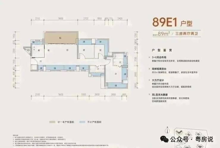 89㎡的3房2厅2卫,B户型,设计的是经典竖厅格局,进门入户玄关,客厅3.5米开间,三开间朝南,,主卧+1个次卧270°飘窗,3个卧室分别做到了主卧15.1㎡/次卧8.52㎡/次卧7.77㎡(包含墙体飘窗),得房率约:77.39%(不含赠送),西南朝向。赠送面积16.96㎡,加上赠送得房率96.84%。