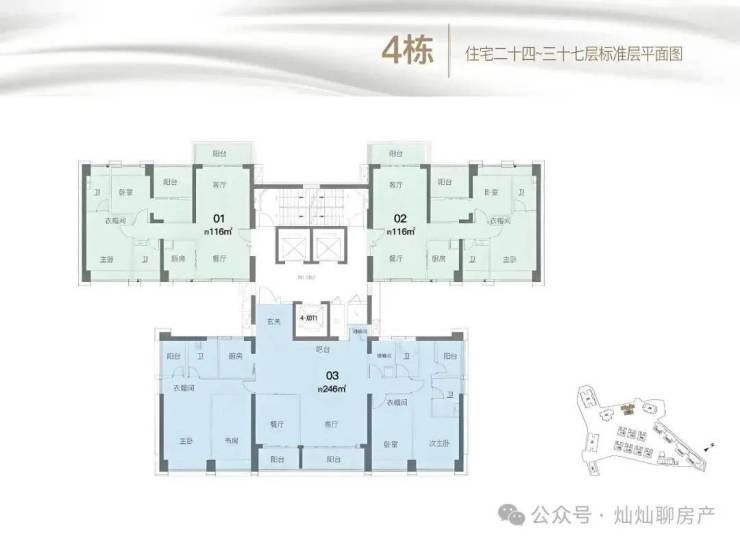 户型解析:高区24楼以上是3梯3户,01和02户型115㎡西向看大南山,03户型246㎡看山海景观及城市景观。。