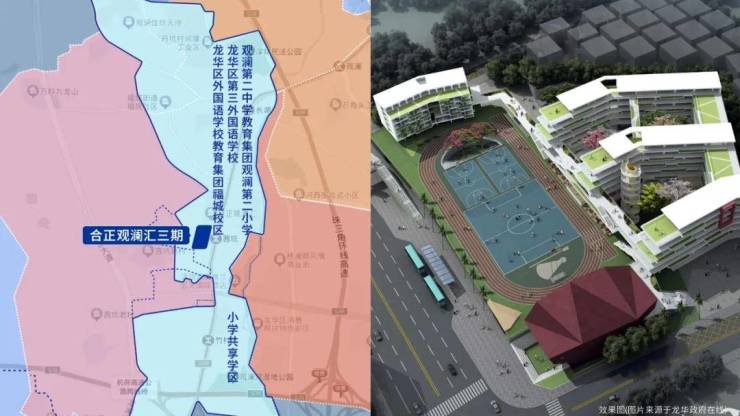 其中龙华外国语学校福城校区就在小区家门口,在2024年首次招生,目前正在龙华第三外国语学校借读小学部,在2024年小学录取积分是第五类74.6分(非深户+学区商品房),初中部暂未招生。
