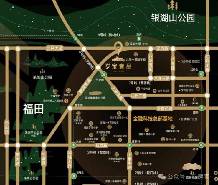 该项目与地铁 6 号线、7 号线换乘站 " 八卦岭站 " 无缝接驳,同时距离 9 号线较近,便捷的轨道交通让其成为真正的双地铁上盖物业。同时,岁宝壹品紧邻笔架山公园和深圳市体育中心,未来体育中心所在的空中连廊入口就在岁宝壹品旁边,让其与福田顶级城市资源无缝连接。此外,岁宝壹品与周边交通、市政配套、商圈、自然生态等完美融合,让项目成为城市建设一部分,让城市优势资源成为项目强大支撑。