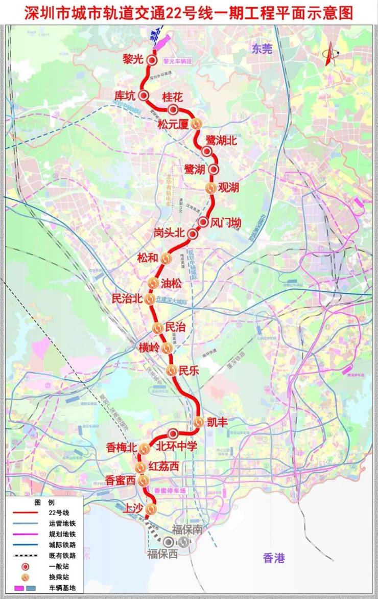 22号地铁线:总投资近400亿元,一期工程在2024年1月份正式开工,起自福田区上沙站,途径龙岗区,止至龙华区黎光站,预留向北延伸至东莞的条件,线路全长34.7公里,总设站21座,设计时速100公里,在未来将实现福田中心区与观澜组团中心45分钟通达的规划目标。