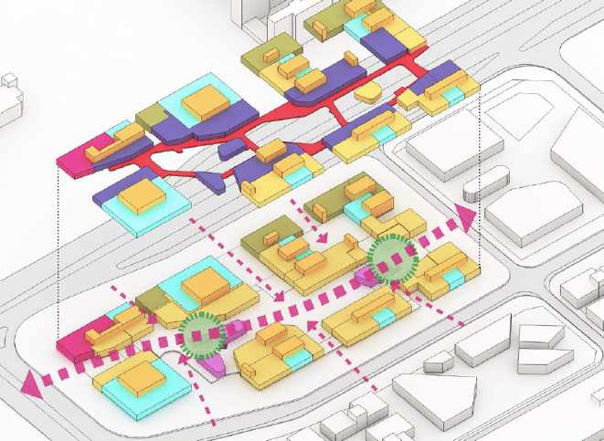 总体建筑布局顺应城市设计,呼应中心广场与视线通廊,来自城市各个方向的人行动线将底层划分为开放的城市活力街区。通过街巷空间的模拟、提炼,结合实际功能需求及空间感受,重塑了底层活力街区的尺度。设计师在主要的街区流线交叉点,植入不同特色功能的庭院空间,有效地激活片区、街区。在上述底层街区的基础上,设计师还将其与复合多元化的公共活动庭院通过楼梯、扶梯、电梯、坡道等垂直交通方式进行有机联系,使其成为立体化城市活力街区。这为后期运营中各类公共活动、公共艺术搭建了舞台,营造了丰富的城市生活,紧密连接了城市空间。
