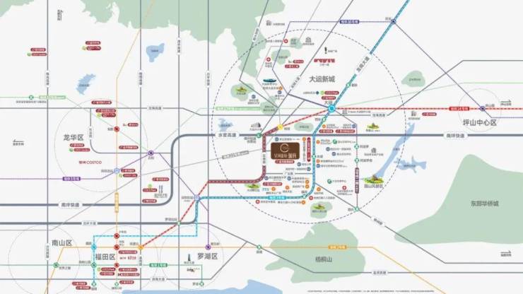 周边环绕龙岗大道、水官高速、南坪快速等主干道,形成“五纵四横”路网结构,自驾便捷。