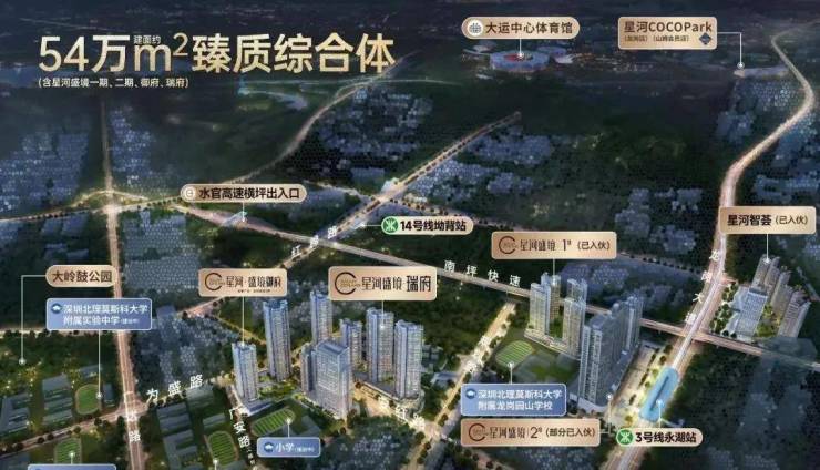 星河盛境3期,位于深圳市龙岗区园山街道,地处大运板块核心区域,毗邻地铁3号线永湖站及14号线坳背站,是双地铁覆盖的TOD综合体项目。