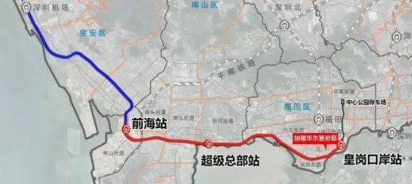 穗莞深城际(建设中)延长线——穗莞深城际前海至皇岗口岸段设有皇岗口岸站,途径南山、福田等地,建成通车后2站到前海,1站到深圳湾总部基地。