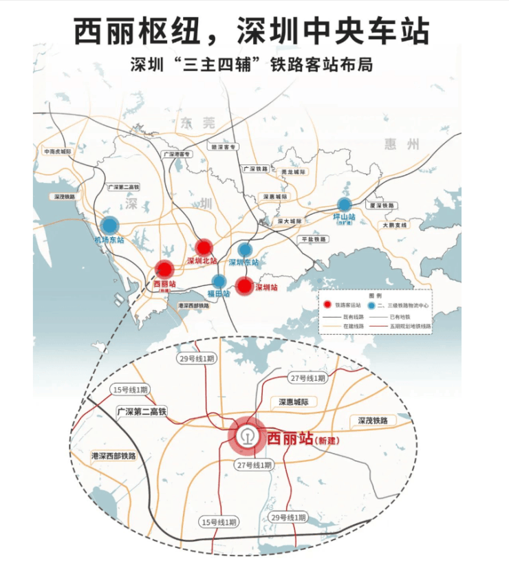 这里将引入赣深、深茂、深汕、深珠4条铁路。同时地铁13/15/27/29号线、深惠、深莞城际也将在此设站