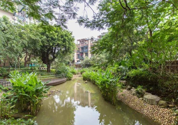 项目内部打造了一条沿着台地蜿蜒的溪流,该水系为市面罕见的活水溪流,贯穿整个社区园林,依据溪岸的曲直不同和地形变化,打造叠水、溪流、瀑布、水潭等多样特色水景,溪岸植物种类繁多,与水流互为风景,沿岸专门设置不同的亲水平台,营造自然灵动的栖心之境。