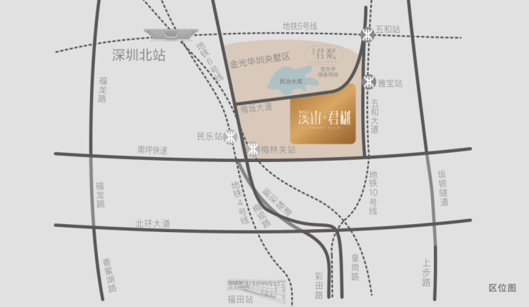 小区周边已有交通网络四通八达,梅坂大道、梅龙路、福龙路、新区大道、民治大道、梅观高速及南坪快速等主干道临近项目周边,从小区出行至福田区、南山区、龙华、布吉等区域十分便利。随着地铁四号线(民乐站)、五号线以及深圳火车站等轨道交通的建成,将大大提升小区出行的交通便捷度