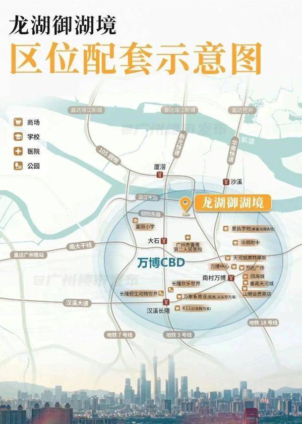 龙湖御湖境周边商业配套丰富,车行7分钟可达万博商圈,20分钟可达珠江新城商圈及琶洲-广州塔商圈,汇聚天河城、K11、四海城等十大旗舰商业体。